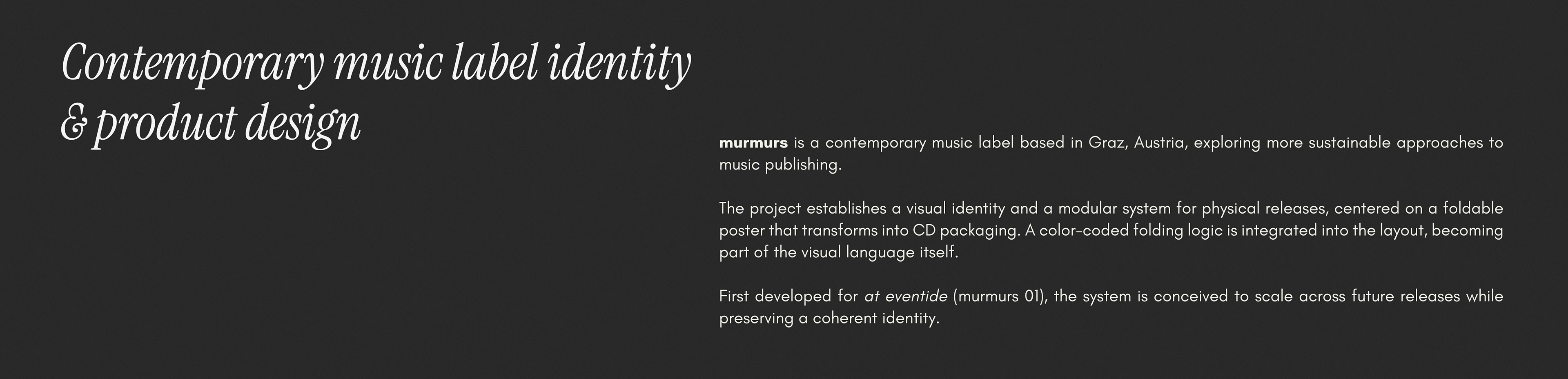Role: identity design (logo + brand system), packaging template & layout, production documentation. Developed for murmurs (Graz, Austria)